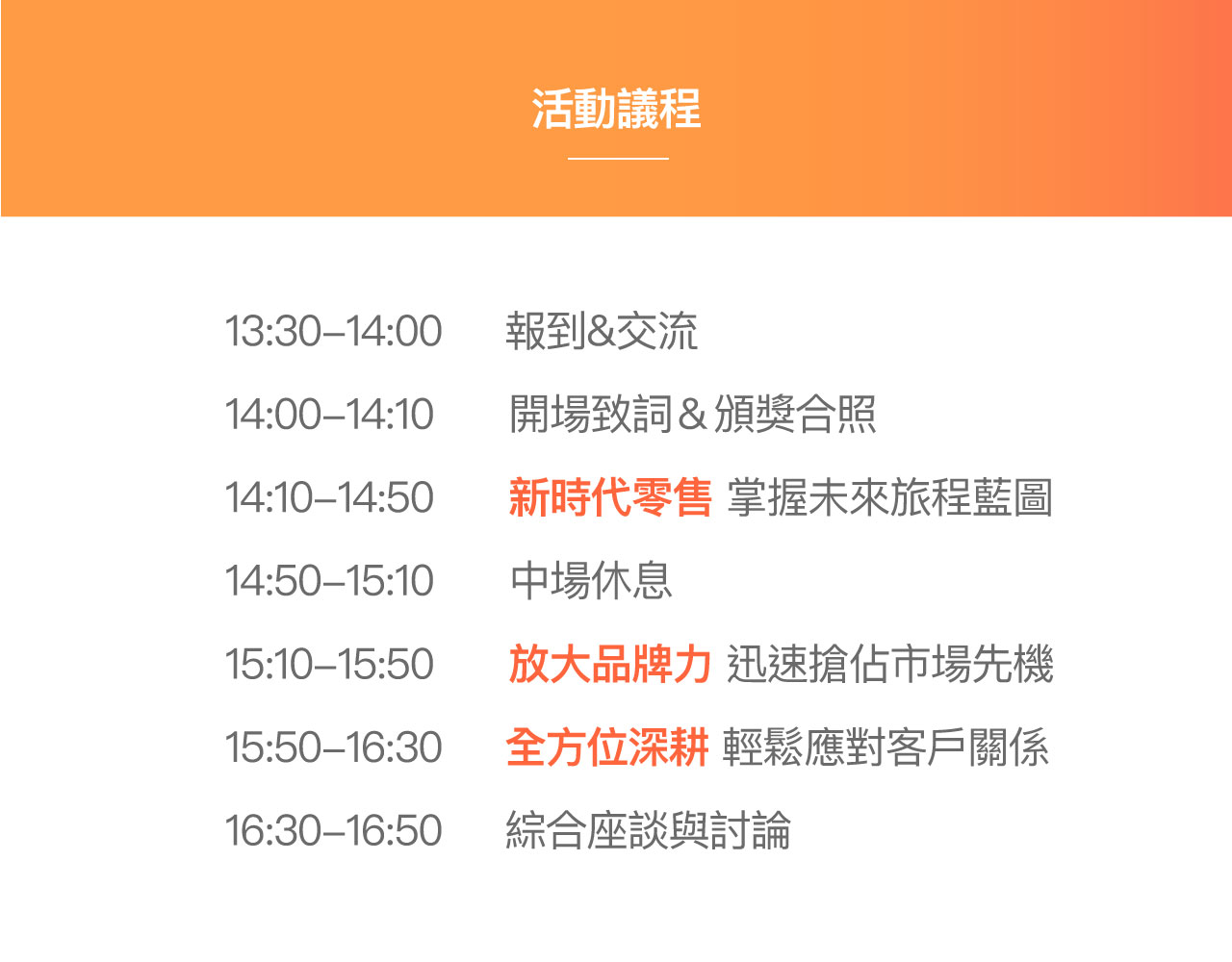 您是否在面對零售業務中品牌曝光不足、行銷效果不佳、客戶體驗不夠精細、數據整合困難等挑戰?本場工作坊將帶領與會者探索最新的智慧零售策略,運用大數據、AI技術及全渠道整合方案,突破傳統零售瓶頸,全面提升品牌競爭力,重新定義客戶旅程,開啟智慧零售的新篇章!