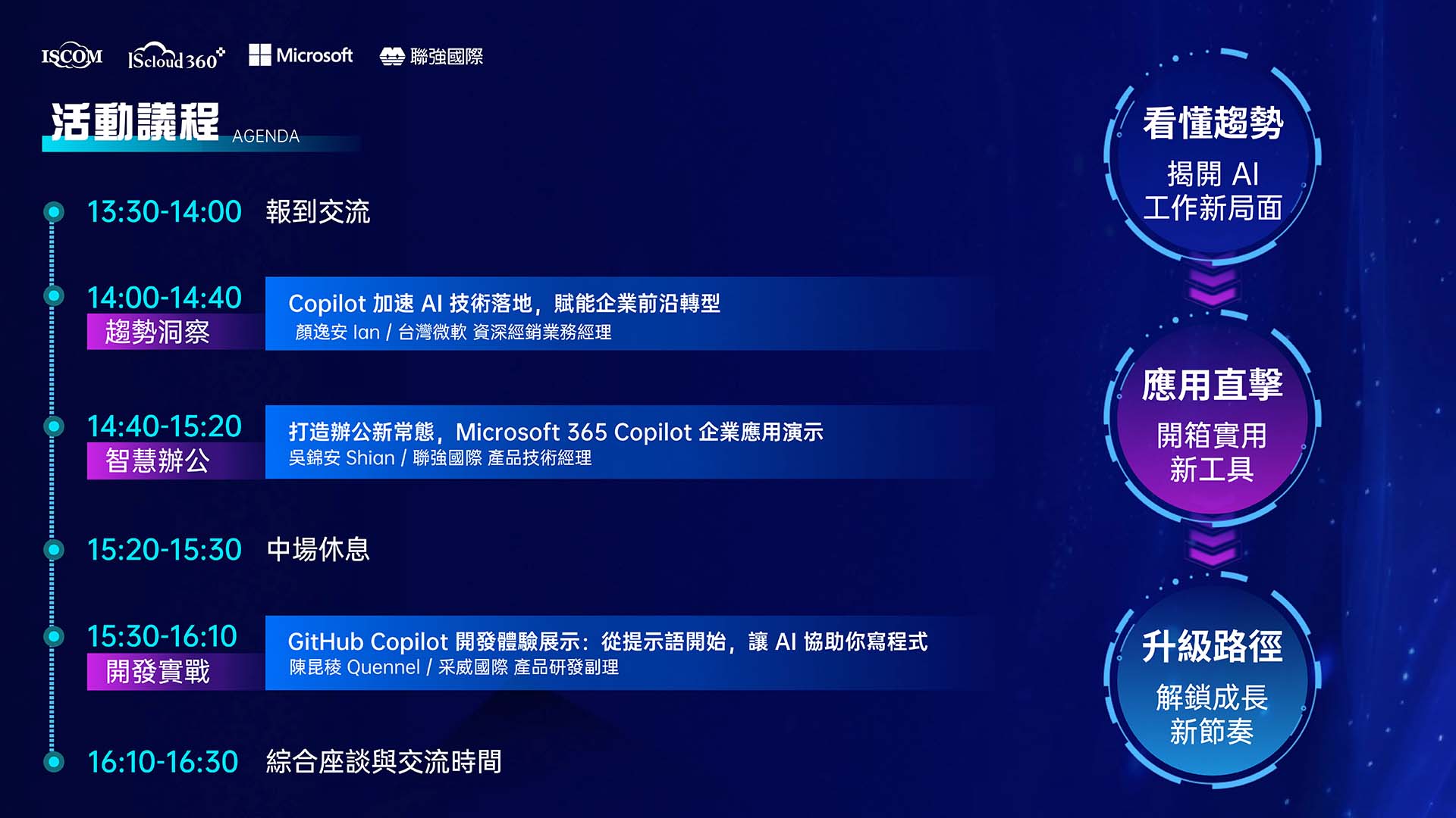 這場工作坊將帶您實作 Copilot,學會如何讓 Word、Excel、PowerPoint 與程式碼撰寫更高效,幫團隊減少加班、提升產出。