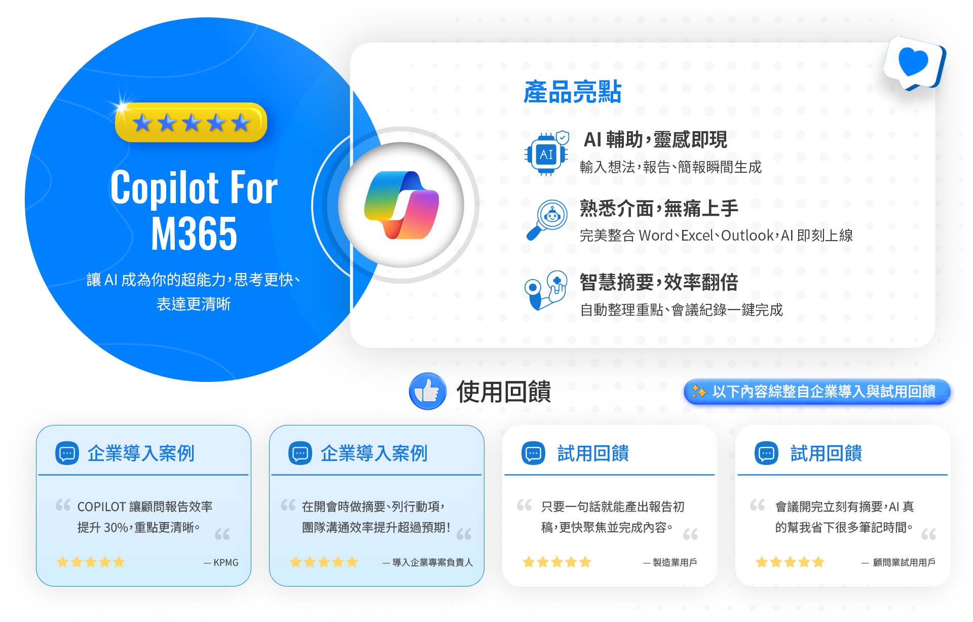 「以前最怕會議紀錄,現在 Copilot 幫我一鍵生成摘要,整理速度快到讓人上癮!」