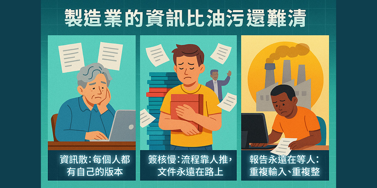 這幾年,大家都在談「智慧工廠」、「自動化產線」, 但真正拖慢製造業效率的,往往不是機台,而是那一張張等簽的表單、那一份份要重整的報表。
