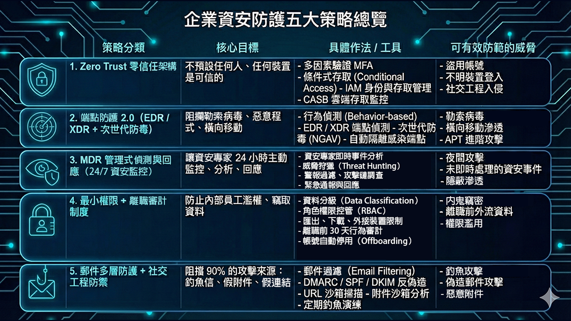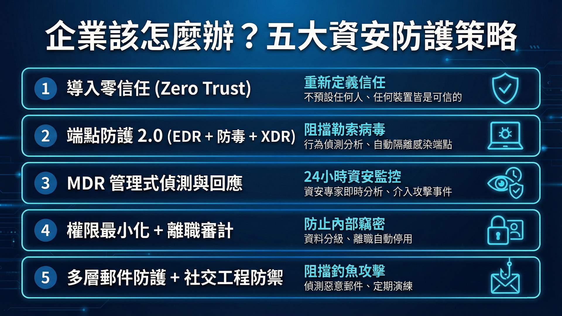 以下是企業最該立即採取的 五大資安防護策略,每一項都是從真實事件中總結出的血淚教訓,可以有效降低遭受外部攻擊或內部竊密的風險。
