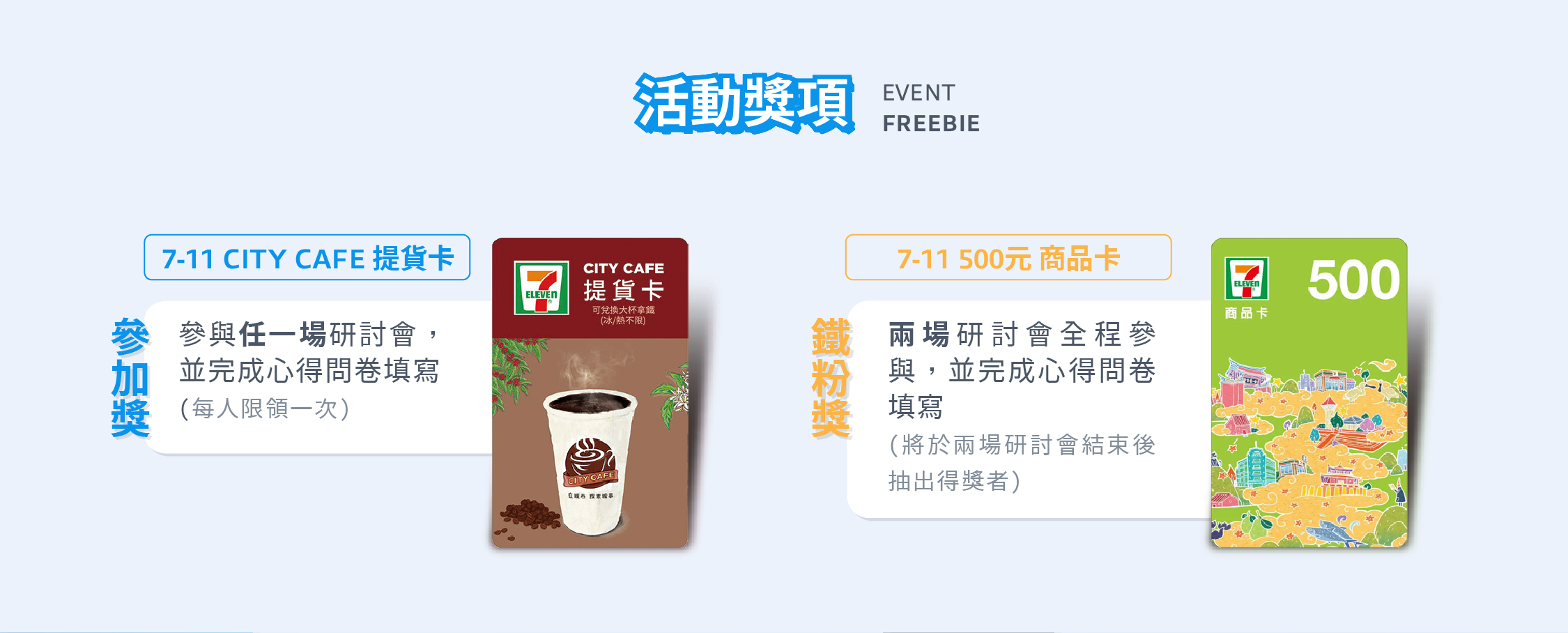 - 本活動好禮7-11超商禮券為實體禮券,請參加者務必留存正確之地址;本公司將於兩場活動結束後,公開抽出得獎者,請協助留意相關訊息。