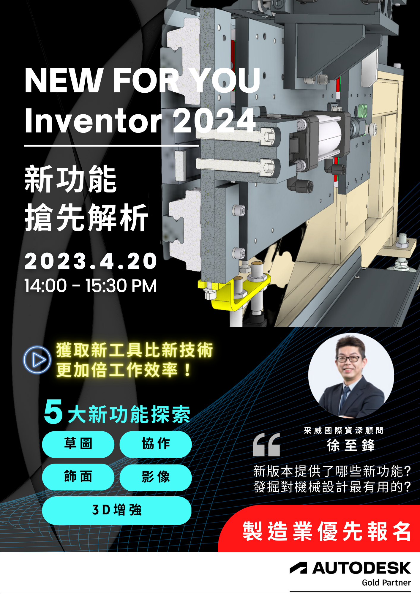Autodesk Inventor 2024 已經驅動新能量上市,不斷提升效能,各貼近使用者的新功能你知道有哪些嗎? 4/20(四) 本堂大師講座|讓我們來了解到這個 2024最新版本提供了多少新功能? 對我們原本版本使用者最有用的功能又是什麼? 值得我們更新? 花 1 個小時來搶先認識新功能!