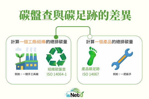 以手工具產業為例,碳盤查是計算該工廠(或組織)的整體碳排放量(如一間手工具工廠),而碳足跡則是針對該產業生產的產品(如一把板手),在其生命週期內的總碳排放量進行盤點,包括原材料開採、加工、生產、配銷以及使用階段和終止處理等各個環節的分析。