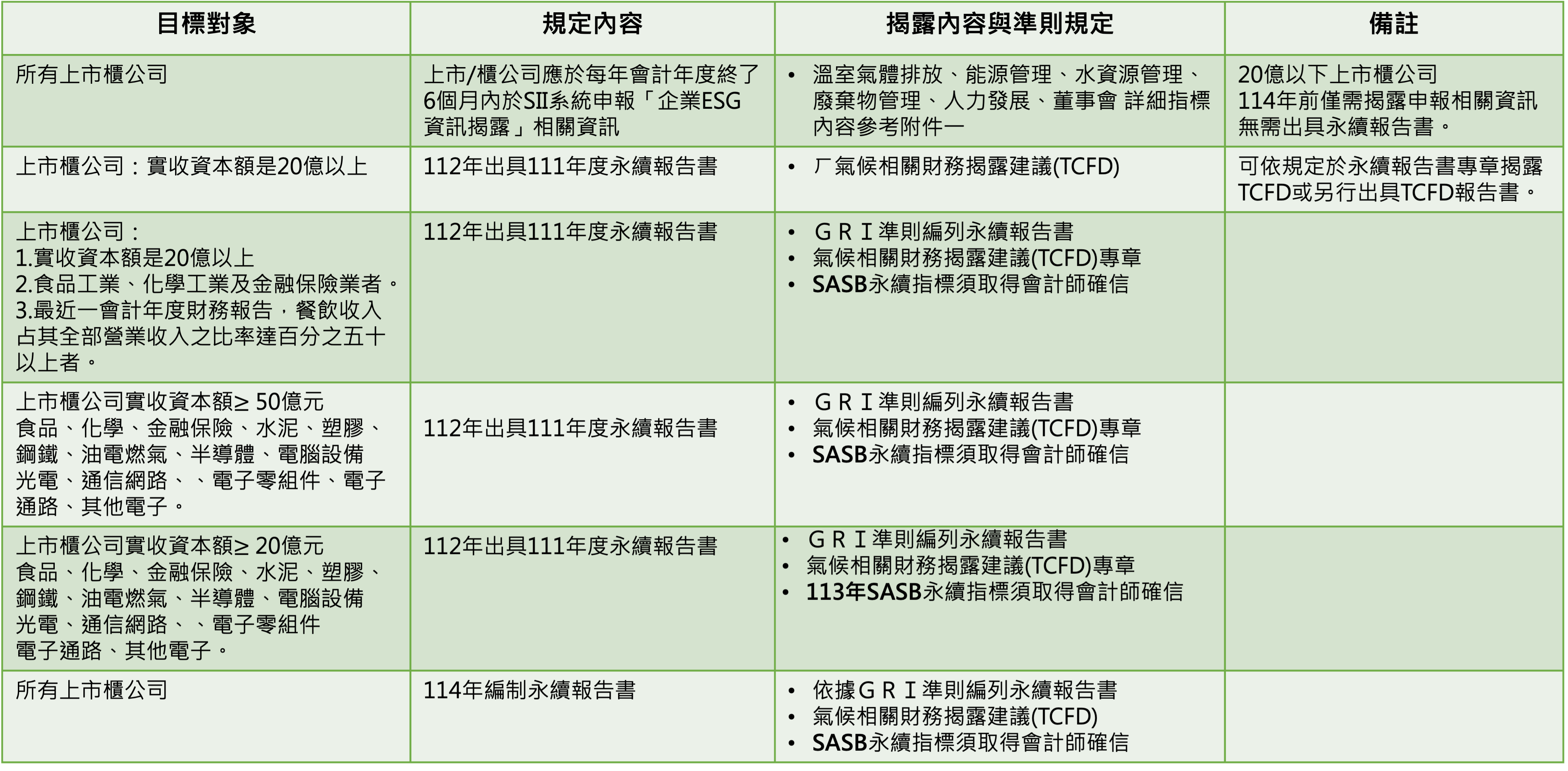 根據金管會「公司治理3.0-永續發展藍圖」規劃的時程,考量國際投資人及產業鏈日益重視環境、社會及治理(ESG)相關議題,為提醒企業重視ESG相關利害關係議題,並提供投資人決策有用的ESG資訊,自今年(2023年)起,資本額20億以上的上市櫃公司,需編製並申報永續報告書,參考國際相關準則,強化資訊揭露。