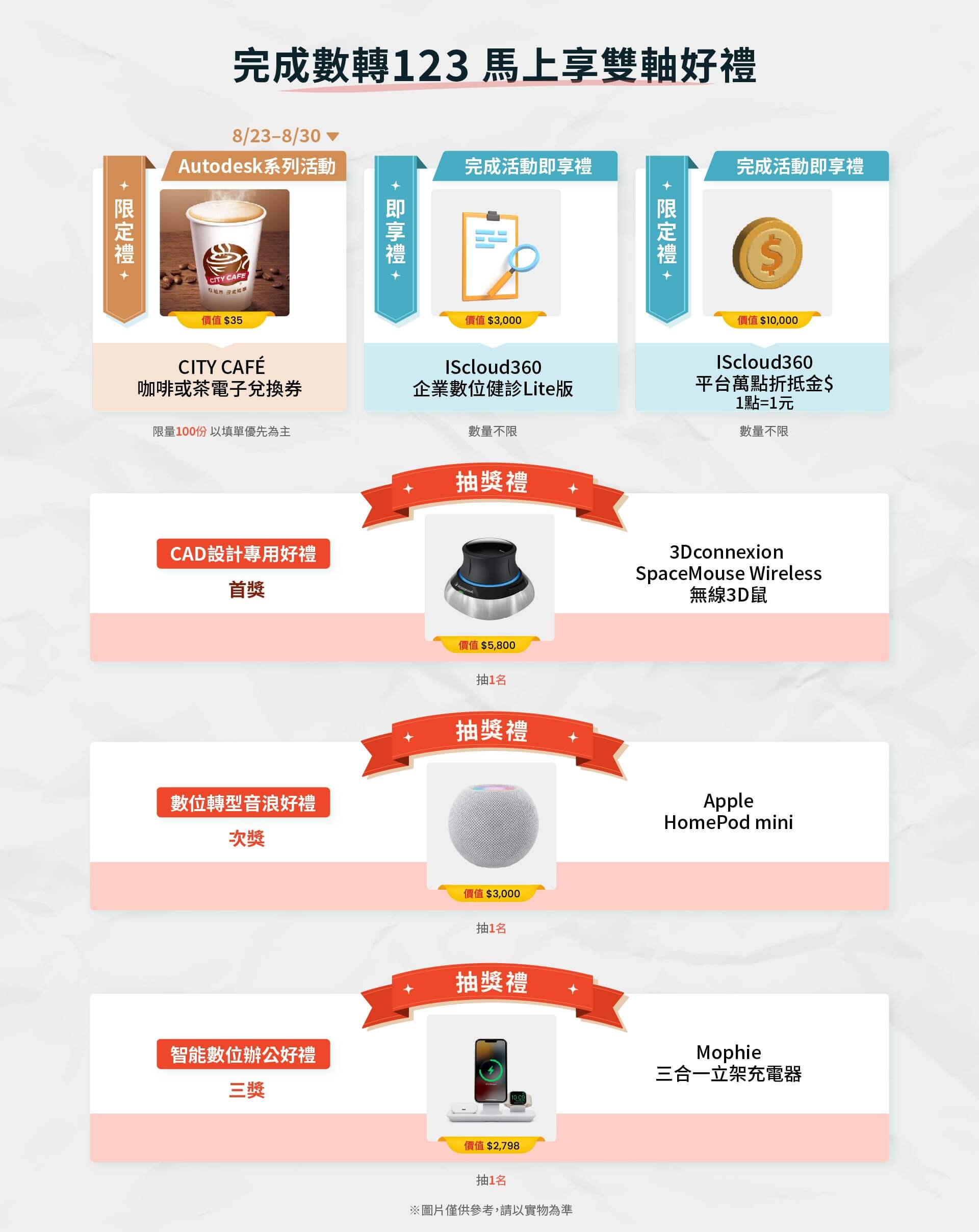 於本活動期間內,完成填寫問卷且成功送出表單者,即享3Dconnexion SpaceMouse Wireless ,價值$5,800(1名)、 Apple Home Pod mini ,價值$3,000 (1名)、mophie 三合一立架充電器 ,價值$2,798(1 名)的好禮抽獎資格,將於11/08(三)抽出得獎者,敬請關注 IScloud360 官網最新公告。