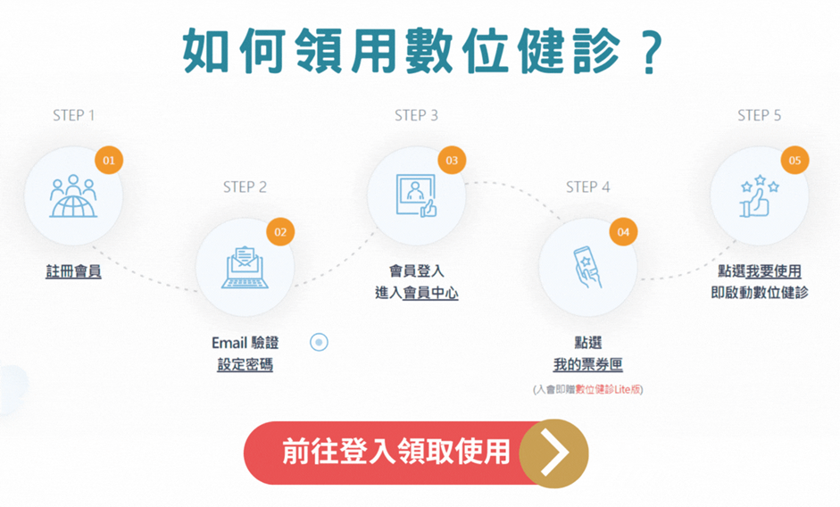 於本活動期間內,完成填寫問卷且成功送出表單者,即成為IScloud360雲端平台會員,於7日內獲得免費健診服務,請登入平台會員查收領取,領取方式請參考下方步驟: