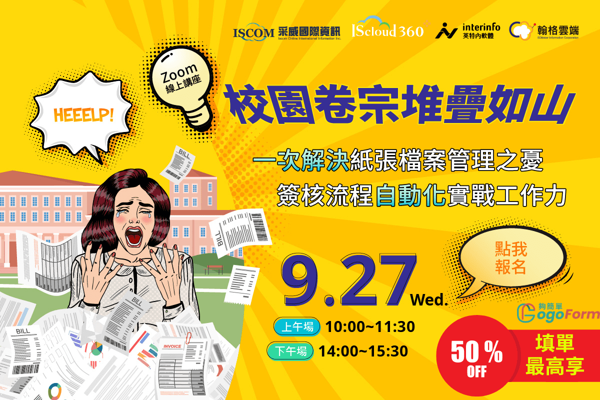 09/27(三) 校園卷宗堆疊如山?一次解決紙張檔案管理之憂! 簽核流程自動化實戰工作力