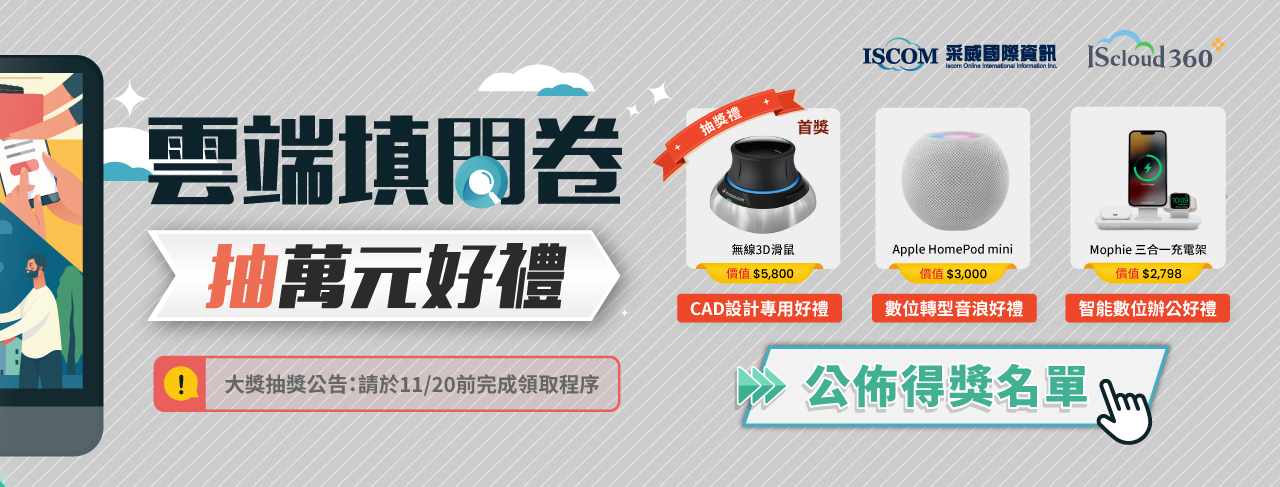 - 活動辦法:於本活動期間8/23(三)-10/29(日)內,完成填寫問卷且成功送出表單者(須符步驟3*),即享3Dconnexion SpaceMouse Wireless ,價值$5,800(1名)、 Apple Home Pod mini ,價值$3,000 (1名)、mophie 三合一立架充電器 ,價值$2,798(1 名)的好禮抽獎資格。*第3步驟設定密碼送出表單即同步成為平台會員,會員須為以公司為單位,此會員認列將依中華民國營業人統一編號登記為主,符合資格方獲得活動資格,取得活動權益可機會贈獎。