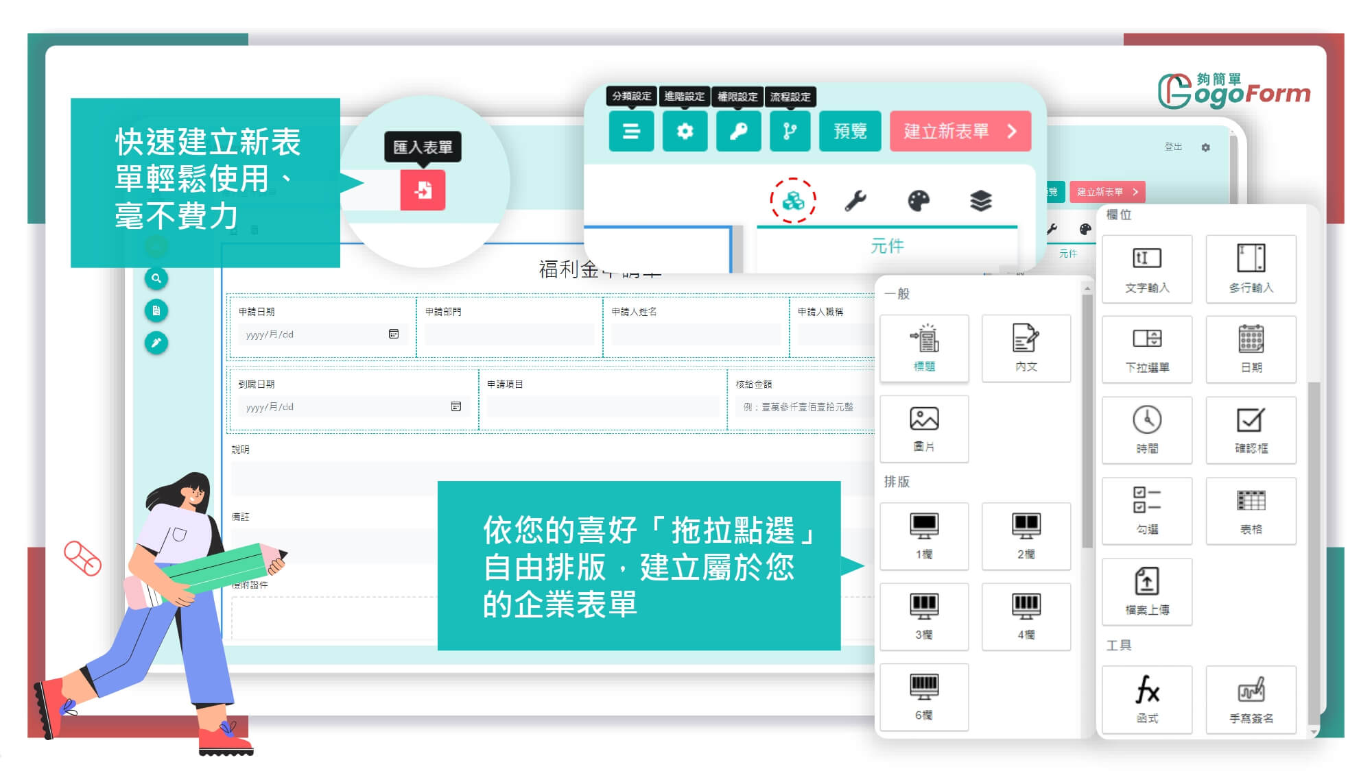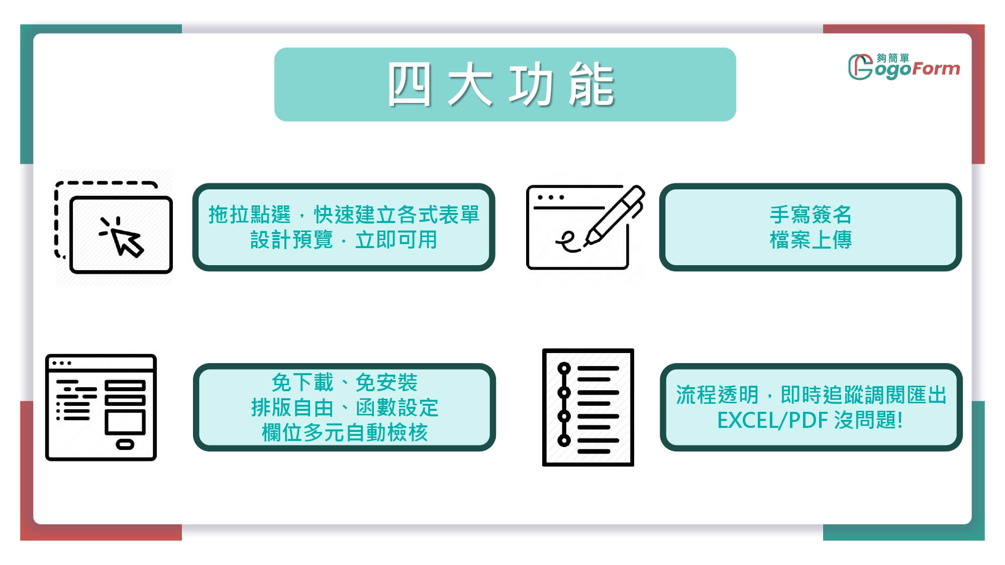 「為什麼需要夠簡單GogoForm?」 ✔️想製作表單不用再委託IT人員 ✔️企業所有表單都能輕鬆電子化 ✔️表單隨便做做都又漂亮又專業 ✔️簽核流程、電子簽名都能設定 ✔️再幫你檢核表單內容填寫情形 企業煩惱就交給GogoForm! | ![]() | |