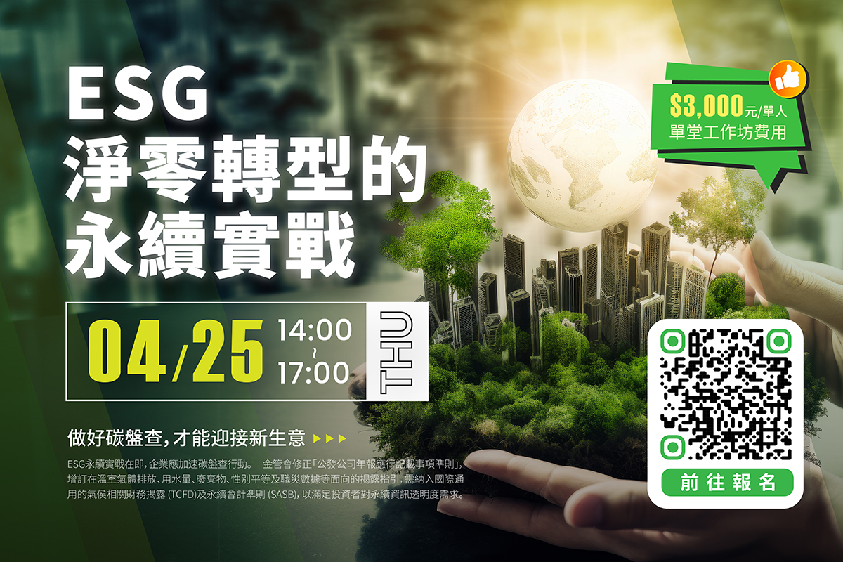 4/25(四)【ESG工作坊】ESG淨零轉型的永續實戰,等您一起實戰ESG永續新生機。